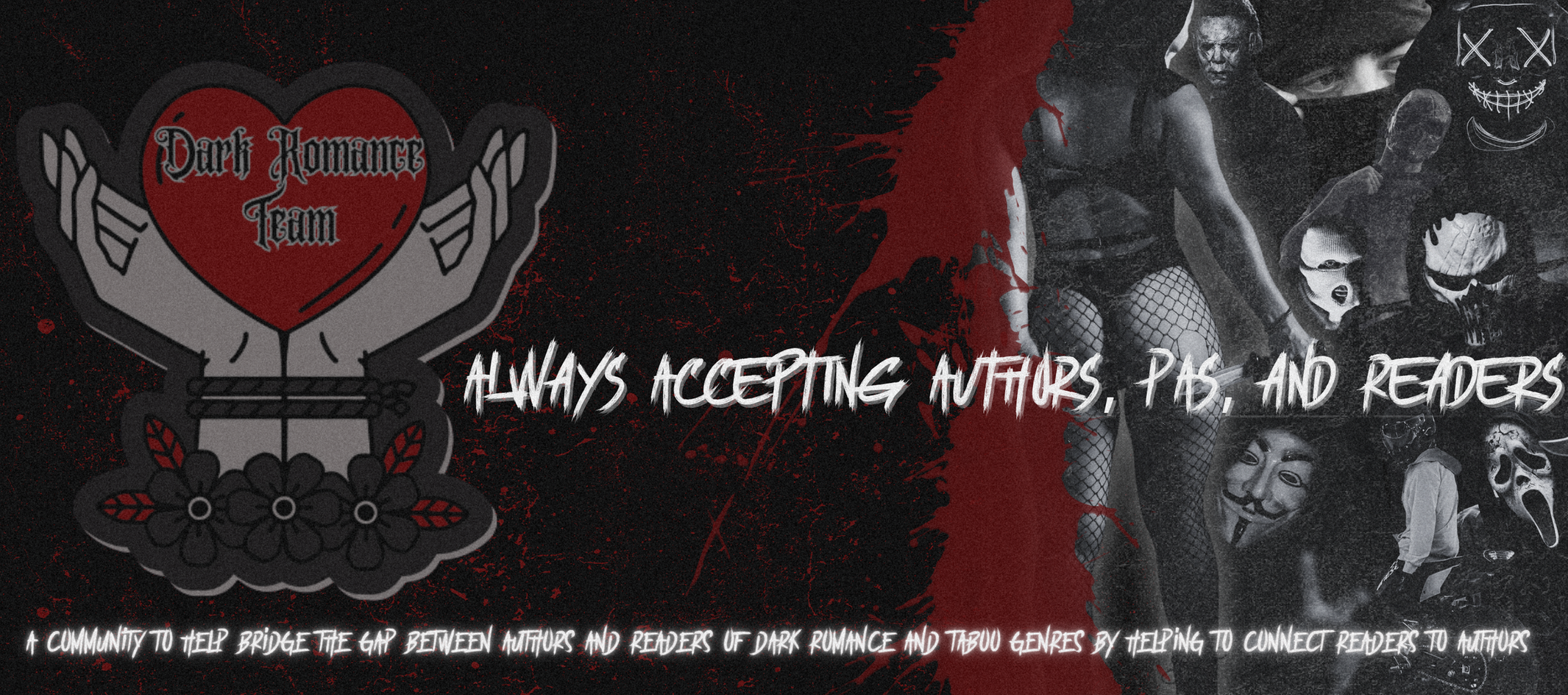 The Dark Romance Team is a community that was created in July 2024 to help bridge the gap between authors and readers of Dark/Taboo Romance genres by providing easy options for sharing authors’ team sign-ups, reveals, promos, releases, etc. with readers, as well as providing opportunities for readers to connect to authors directly.
